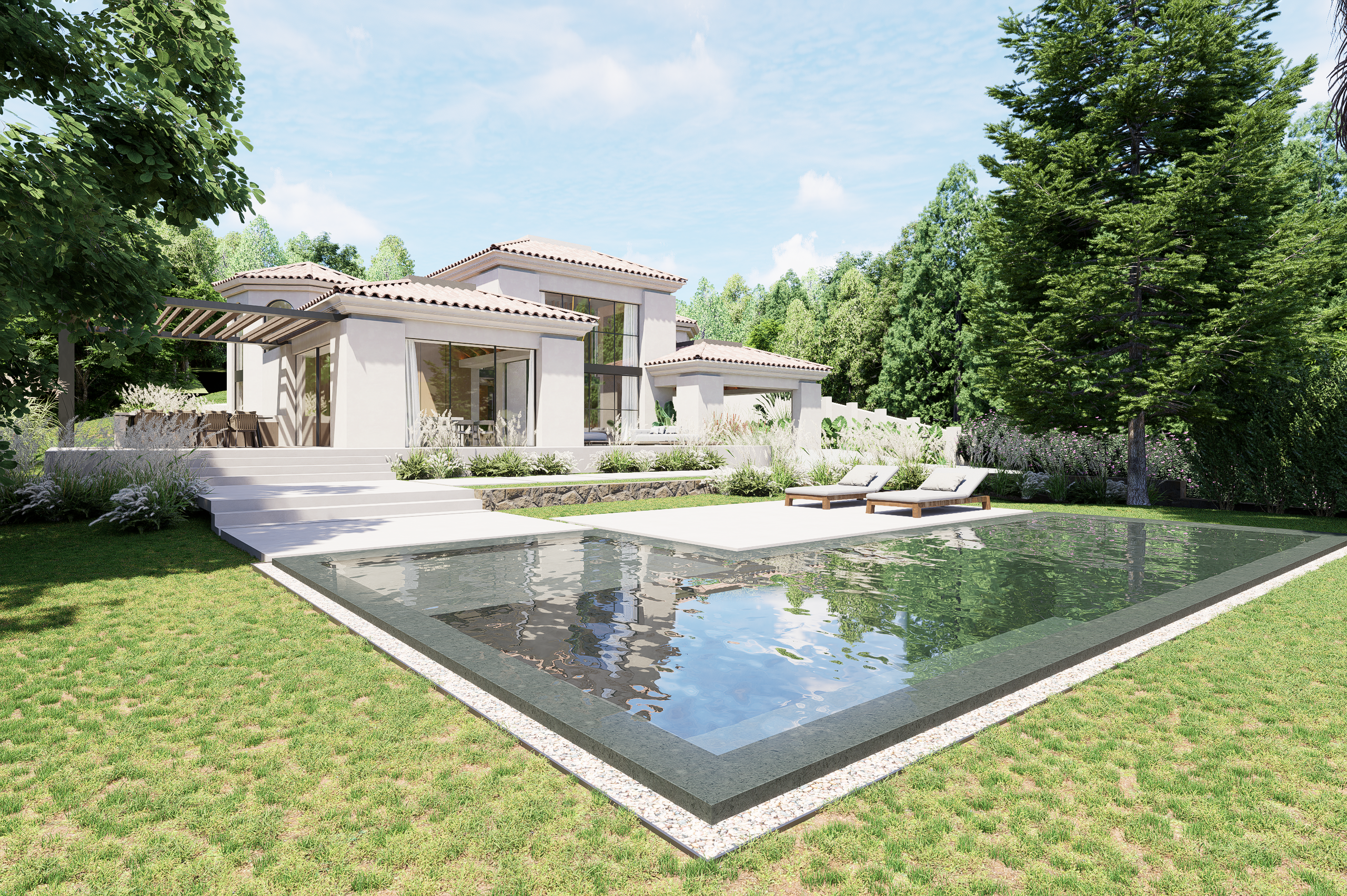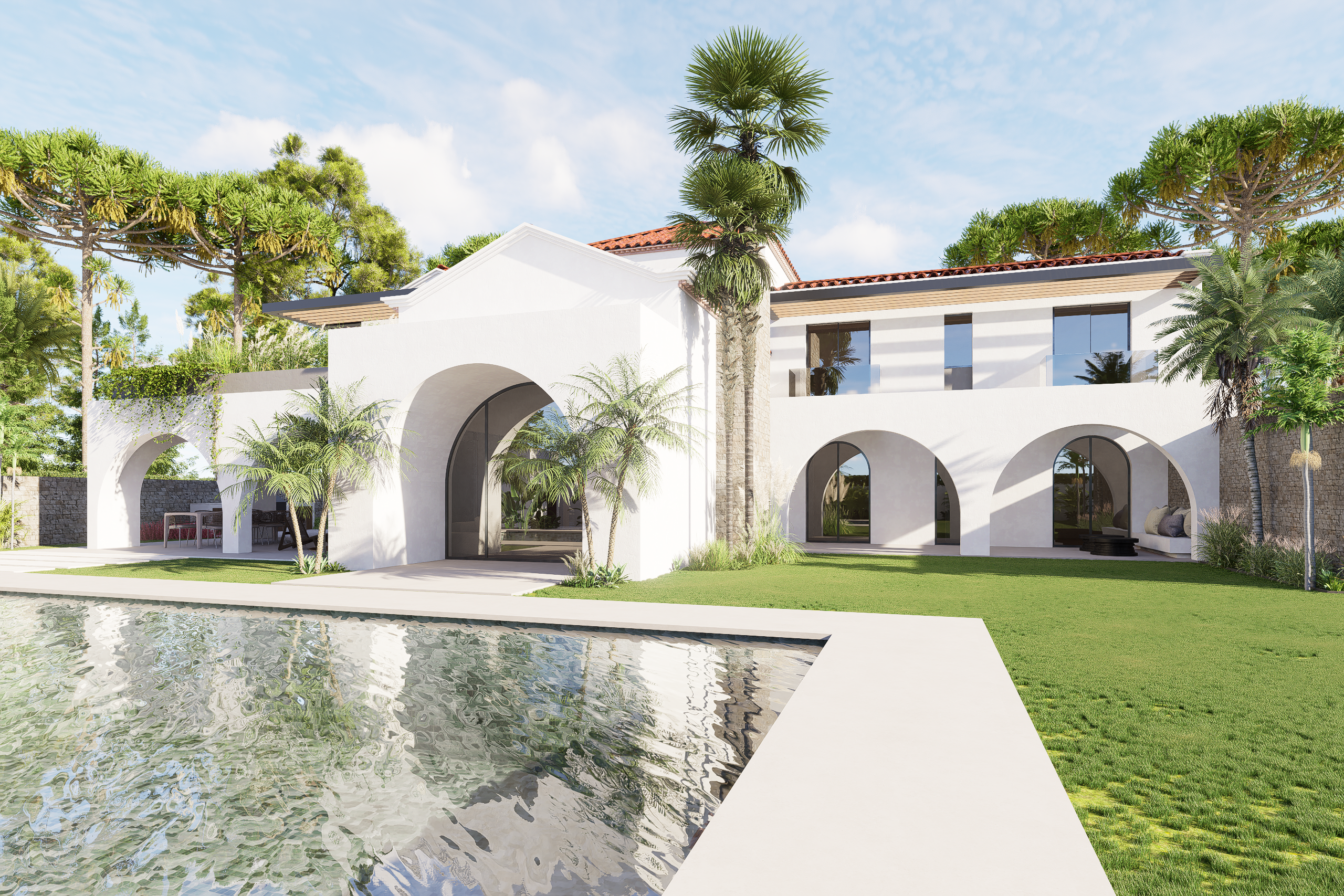 Renovación integral de una antigua villa española con vistas panorámicas al mar en Mijas, desarrollada sobre una parcela de 1.800 m² con 850 m² construidos. El proyecto incluye una poolhouse en el mismo estilo arquitectónico de la vivienda principal y conserva determinados rasgos exteriores originales para respetar y honrar el diseño inicial.